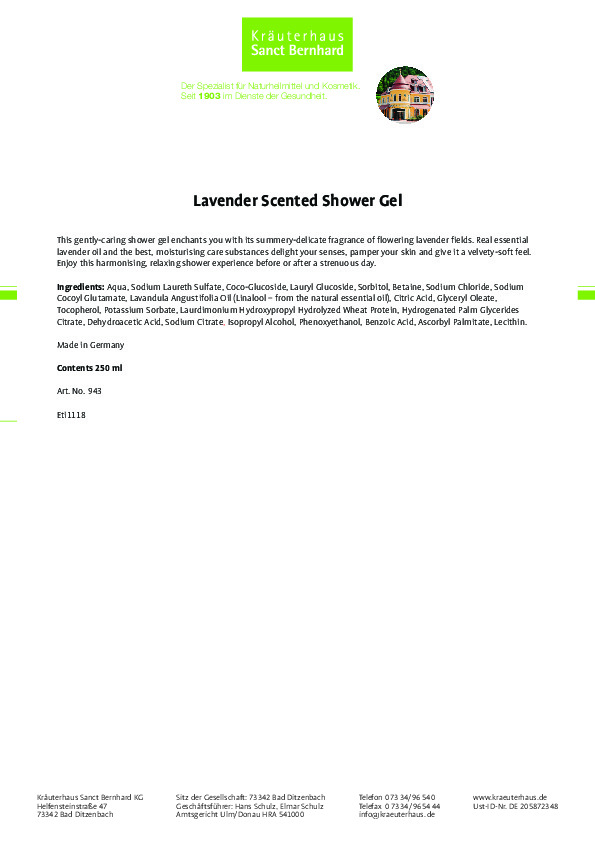 Sữa tắm thơm hoa oải hương có thành phần: Aqua, Sodium Laureth Sulfate, Coco-Glucoside, Lauryl Glucoside, Sorbitol, Betaine, Sodium Cloride, Sodium Cocoyl Glutamate, Lavandula Angustifolia Oil (Linalool - từ tinh dầu tự nhiên), Citric Acid, Glyceryl Hydroxypropyl Protein thủy phân lúa mì, Hydrogenated Palm Glycerides Citrate, Dehydroacetic Acid, Sodium Citrate, Isopropyl Alcohol, Phenoxyethanol, Benzoic Acid, Ascorbyl Palmitate, Lecithin.