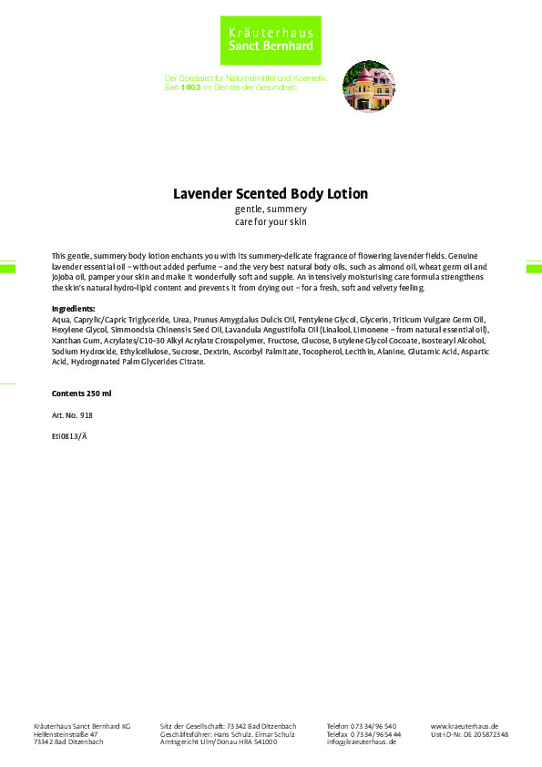 Sữa dưỡng thể hoa oải hương có thành phần: Aqua, Caprylic / Capric Triglyceride, Urea, Prunus Amygdalus Dulcis Oil, Pentylene Glycol, Glycerin, Triticum Vulgare Germ Oil, Hexylene Glycol, Simmondsia Chinensis Oil Oil, Lavandula Angustifolia Oil .