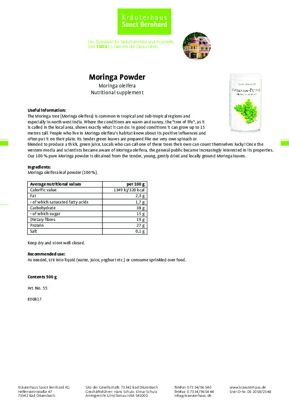 Bột chùm ngây Moringa powder Chiết xuất từ 100% bột chùm ngây nguyên chất (Moringa oleifera).