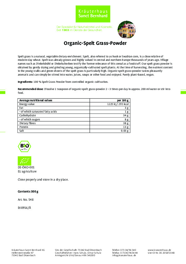 Bột cỏ lúa mì hữu cơ Organic Spelt Grass Powder của hãng Sanct- Bernhard được trồng hoàn toàn theo phương pháp hữu cơ, thu hoạch bằng cách làm khô và nghiền nhẹ. Bột cỏ lúa mì có vị thơm dễ chịu, đơn giản được pha với nước hoặc nước trái cây, súp, các thực phẩm khác. Đây là sản phẩm thuần chay. Sản phẩm đã qua kiểm nghiệm, cam kết 100% hàng chính hãng thương hiệu Sanct Bernhard của Đức