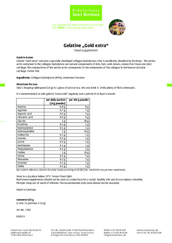Gelatine Gold extra chứa 90% collagen thủy phân được phát triển đặc biệt giúp cơ thể hấp thụ tối đa. Các axit amin có trong collagen thủy phân là thành phần tự nhiên của da, tóc, móng, xương, mô liên kết và sụn khớp.