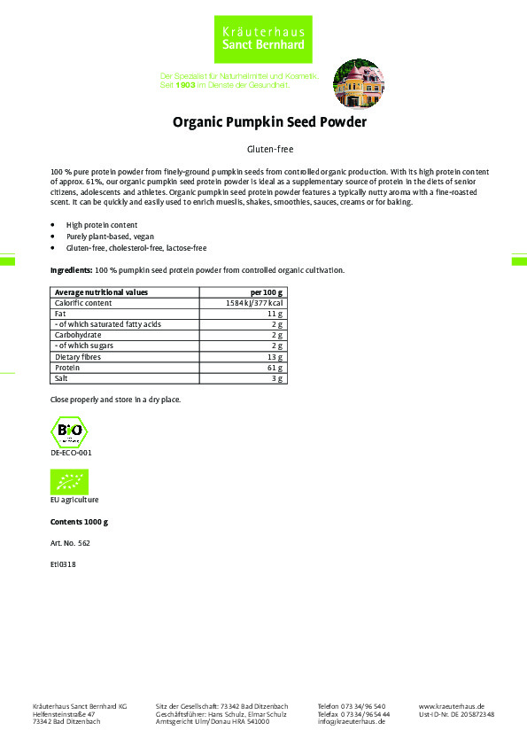 Sản phẩm Bột hạt bí ngô hữu cơ Organic Pumpkin của hãng Sanct- Bernhard chứa 100% bột protein nguyên chất hạt bí ngô nghiền mịn từ sản xuất hữu cơ có kiểm soát.