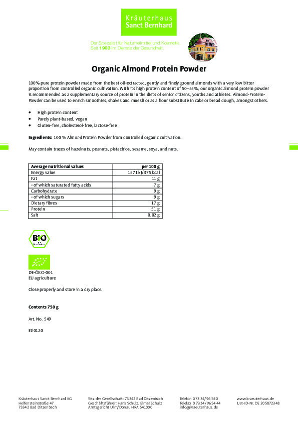 Hạnh nhân đã được đánh giá cao từ thời cổ đại, ngày nay lợi ích dinh dưỡng của hạnh nhân được ca ngợi trên toàn thế giới. Sản phẩm Bột protein hạnh nhân hữu cơ Organic Almond của hãng Sanct- Bernhard chứa 100% bột protein nguyên chất được làm từ những quả hạnh nhân tốt nhất, được nghiền nhẹ và mịn với tỷ lệ đắng rất thấp từ quá trình canh tác hữu cơ có kiểm soát. Sản phẩm đã qua kiểm nghiệm, cam kết 100% hàng chính hãng thương hiệu Sanct Bernhard của Đức