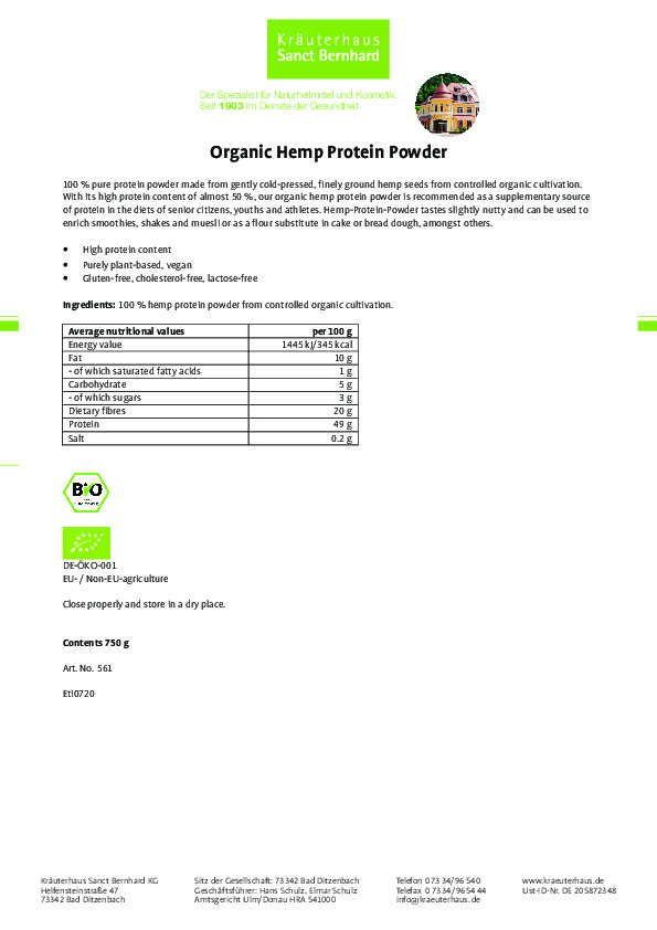 Sản phẩm Bột protein từ cây gai dầu hữu cơ Organic Hemp của hãng Sanct- Bernhard chứa 100% bột protein nguyên chất được làm từ những quả gai dầu tốt nhất, được nghiền mịn từ quá trình canh tác hữu cơ có kiểm soát.