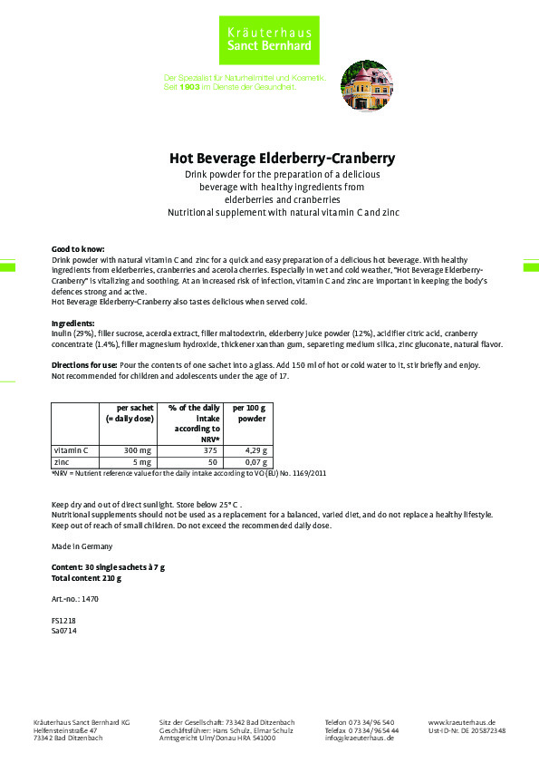 Bột uống bổ sung Vitamin C và Kẽm Elderberry Cranberry được chuẩn bị như một thức uống lạnh giải khát vào mùa hè cũng như làm ấm cơ thể vào mùa đông. Một gói hỗ trợ mọi hoạt động của hệ thống miễn dịch diễn ra bình thường, tăng cường hệ miễn dịch của cơ thể và tăng sức đề kháng, tránh các nguy cơ nhiễm bệnh. Sản phẩm đã qua kiểm nghiệm, cam kết 100% hàng chính hãng thương hiệu Sanct Bernhard của Đức