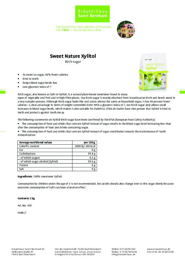 Sản phẩm Đường bạch dương tự nhiên Nature Xylitol Birch là một sản phẩm làm ngọt thay thế đường tối ưu hoàn toàn tự nhiên an toàn thích hợp cho những người theo chế độ ăn kiêng, Keto, tiểu đường, eatclean đặc biệt không gây sâu răng. Sản phẩm đã qua kiểm nghiệm, cam kết 100% hàng chính hãng thương hiệu Sanct Bernhard của Đức.