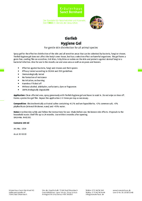 Dạng gel xịt để khử trùng hiệu quả chậu, lồng, hộp, tay cầm và tất cả các bề mặt có thể bị vi khuẩn, nấm hoặc vi rút xâm nhập. Gel vệ sinh không ảnh hưởng tới các mô của cơ thể, nhưng có tác dụng chọn lọc đối với các sinh vật có hại. Gel tạo thành một lớp màng mát, vô trùng trên các vết trầy xước, chàm, bọ ve cắn, vết cắn ngứa, tưa miệng, nấm da và phát ban và bảo vệ chống lại nấm da và nhiễm khuẩn. Sản phẩm cũng có thể sử dụng cho vùng miệng, tai và hậu môn, cũng như trên móng guốc. Sản phẩm dành cho động vật đã qua kiểm nghiệm, cam kết 100% hàng chính hãng thương hiệu Sanct Bernhard của Đức.