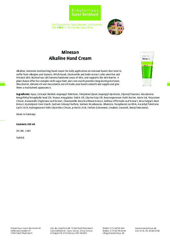Đôi bàn tay của bạn luôn trong tình trạng khô, ráp, thậm chí nứt nẻ đau đớn khi tiếp xúc nhiều với nước hay vào mùa đông khô hanh; vậy thì kem dưỡng da tay sẽ là trợ thủ đắc lực không thể thiếu cho bạn sử dụng hàng ngày nhé. Sản phẩm Kem dưỡng ẩm da tay tinh chất muối biển Minesan Alkaline chuyên sâu cho bàn tay giúp dưỡng ẩm, tăng cường hàng rào bảo vệ của da tay, cung cấp độ ẩm lâu dài. Sử dụng hàng ngày trên bàn tay bị căng thẳng, mệt mỏi có xu hướng bị dị ứng và khô ráp. Sản phẩm đã qua kiểm nghiệm cam kết 100% hàng chính hãng thương hiệu Sanct Bernhard của Đức