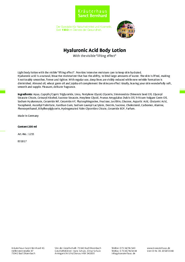 Kem dưỡng ẩm toàn thân Hyaluronic Acid Body Lotion với thành phần Acid hyaluronic và Dầu hạnh nhân, dầu mầm lúa mì và dầu jojoba . Chăm sóc dưỡng ẩm chuyên sâu giúp da căng mịn, sáng bóng và giảm nếp nhăn.