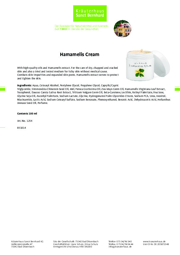 Dòng sản phẩm Kem dưỡng da Hamaelis của thương hiệu Sanct Bernhard của Đức với thành phần chiết xuất từ thảo mộc tự nhiên, hoàn toàn an toàn, lành tính đối với những làn da mỏng manh, nhạy cảm, kết hợp với mùi hương thơm dịu của thảo mộc thiên nhiên mang lại cho bạn cảm giác thư giãn, dễ chịu ngay sau khi sử dụng. Sản phẩm đã qua kiểm nghiệm da liễu, cam kết 100% hàng chính hãng.
