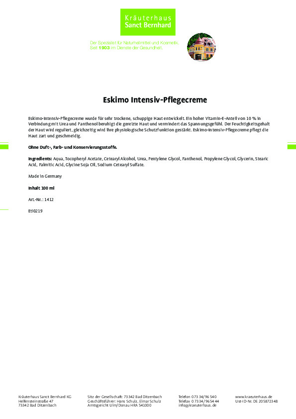 - Eskimo Intensive Care Cream được nghiên cứu, phát triển dưỡng da dành cho làn da cực kỳ khô, bong tróc. Hàm lượng vitamin E cao 10% kết hợp với urê và panthenol làm dịu da bị kích thích và làm giảm cảm giác căng thẳng. Độ ẩm của da được điều hòa và tăng cường hàng rào bảo vệ cho da. Eskimo Intensive Care Cream nhẹ nhàng làm dịu da, da mềm mịn. Không chứa chất tạo mùi, chất tạo màu và chất bảo quản.