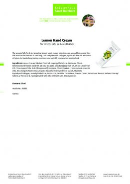 Tay bạn có bị khô ráp khi mùa đông đến hay khi tiếp xúc với nhiều hóa chất? Đừng lo lắng đã có Kem dưỡng da tay hương chanh Lemon Hand Cream được nghiên cứu và ra đời bởi thương hiệu nổi tiếng Sanct Bernhard của Đức. Sản phẩm với chiết xuất chính từ chanh kết hợp với các dưỡng chất dưỡng da giúp cải thiện độ nhăn của da, cung cấp độ ẩm cho da đồng thời nuôi dưỡng da từ sâu bên trong biến làn da khô ráp dần trở nên mềm mại, mịn màng. Kem dưỡng thấm rất nhanh vào da, không gây nhờn rít khó chịu, cho đôi tay của bạn được che trở một cách tuyệt vời nhất. Sản phẩm đã qua kiểm nghiệm da liễu, cam kết 100% hàng chính hãng.