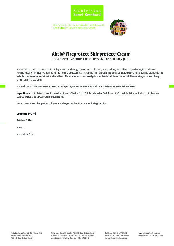 Kem dưỡng da thể thao Aktiv 3 Skinprotect bảo vệ và chăm sóc đặc biệt cho các cơ và vùng đùi sau khi hoạt động thể thao. Giúp tạo thành một lớp màng bảo vệ và chăm sóc xung quanh da, ngăn chặn và giảm tình trạng xuất huyết. Chiết xuất tự nhiên của cúc vạn thọ và birchbark có tác dụng chống viêm và làm dịu vùng da sau các hoạt động thể chất.