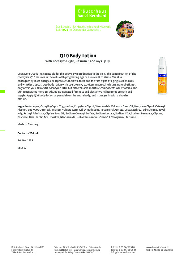 Kem dưỡng toàn thân Q10 Body Lotion là sản phẩm kem trắng da dưỡng ẩm cao cấp của Sanct Bernhard với coenzyme tự nhiên Q10, vitamin E, sữa ong chúa và các loại dầu tự nhiên mang đến cho làn da tươi trẻ tràn đầy sức sống. Làn da được tái tạo tự nhiên một cách nhanh chóng, đàn hồi và mịn màng.