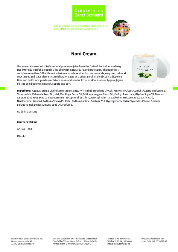Kem dưỡng Noni giúp cung cấp các dưỡng chất cho làn da với nước ép giàu dinh dưỡng từ trái nhàu, dầu mầm lúa mì, dầu jojoba, dầu hạt hướng dương, dầu ngô, chiết xuất từ củ cà rốt, vitamin A, ure và acid lactic. Giúp da mềm mịn, dưỡng ẩm và bảo vệ tự nhiên.