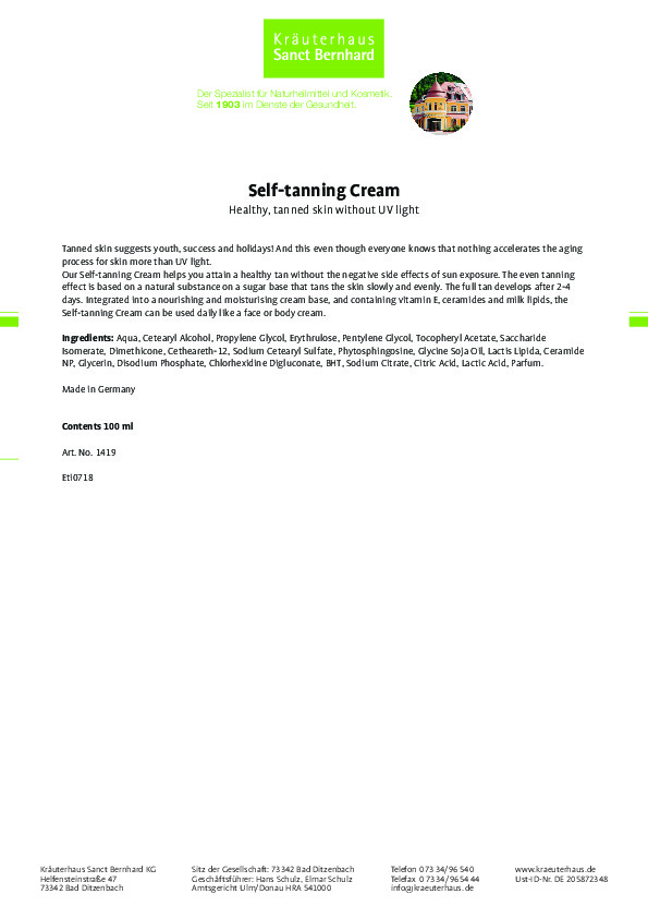 Kem nhuộm da nâu toàn thân Self Tanning Cream giúp bạn có được làn da nâu rám nắng khỏe mạnh mà không cần phải phơi nắng hay chịu các tác dụng tiêu cực của ánh nắng mặt trời khi phơi nắng. Ngoài ra giúp da săn chắc hơn, cung cấp độ ẩm cho da với vitamin E, ceramides và protein tơ tằm. Hiệu ứng da nâu rám nắng dựa trên một chất tự nhiên có gốc đường Saccharide Isomerate giúp da săn chắc và tạo màu rám nắng sau 2 đến 4 ngày. Sản phẩm cam kết 100% hàng chính hãng thương hiệu Sanct Bernhard của Đức