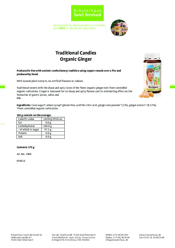 Kẹo gừng truyền thống Traditional Candies là giải pháp giúp bạn giải cảm, giữ ấm trong những ngày lạnh, hoặc làm giảm cảm giác say tàu xe. Kẹo gừng có vị dễ ăn hơn so với việc sử dụng gừng tươi nên được nhiều người lựa chọn hơn. Nguồn nguyên liệu dùng để chế biến kẹo gừng đã được tuyển chọn kỹ càng, sản xuất trên dây chuyền hiện đại nên đảm bảo an toàn cho người dùng. Sản phẩm đã qua kiểm nghiệm, cam kết 100% hàng chính hãng thương hiệu Sanct Bernhard của Đức