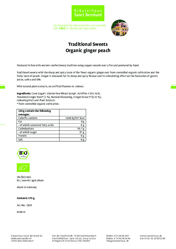 Kẹo hữu cơ vị Đào gừng Organic Ginger Peach giúp hơi thở thơm mát tự nhiên, làm bừng tỉnh tinh thần và mang lại cho bạn những phút giây sảng khoái. Thiết kế dạng hộp nhỏ gọn tiện lợi thích hợp để bạn mang theo bên mình mọi lúc mọi nơi. Sản phẩm đã qua kiểm nghiệm, cam kết 100% hàng chính hãng thương hiệu Sanct Bernhard của Đức