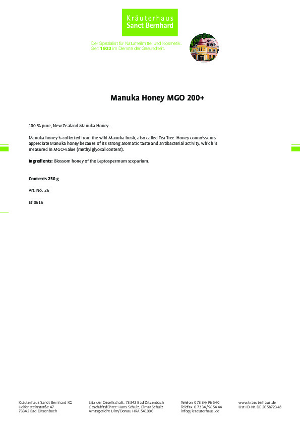 Mật ong xưa nay vẫn được xem là một vị thuốc quý hỗ trợ chăm sóc sức khỏe và sắc đẹp. Mật ong là một chất lỏng ngọt ngào được tạo ra bởi những con ong sử dụng mật từ hoa, có khoảng 320 loại mật ong khác nhau về màu sắc, mùi và hương vị. Sản phẩm Mật ong nguyên chất kháng khuẩn Manuka Honey 200+ của thương hiệu Sanct Bernhard là sản phẩm được thu hoạch và đóng gói tại Đức, là một trong những thực phẩm chức năng nổi bật với công dụng đa dạng như tăng cường hệ thống miễn dịch, phòng chống nhiều bệnh tật, chống oxy hóa, bổ sung nguồn dinh dưỡng cho phụ nữ mang thai, đồng thời kháng khuẩn mạnh giúp bảo vệ cơ thể bạn.