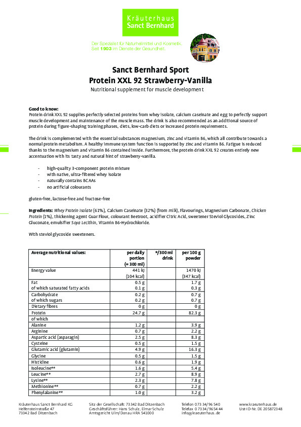 Nước uống bổ sung Protein XXL 92 Sport Protein cung cấp các protein được chọn lọc hoàn hảo từ whey cô lập, canxi caseinat và trứng để hỗ trợ hoàn hảo cho sự phát triển cơ và duy trì khối lượng cơ. Thức uống này cũng được khuyên dùng như một nguồn protein bổ sung trong các giai đoạn tập luyện tạo dáng, ăn kiêng, ăn kiêng low-carb hoặc tăng nhu cầu protein. Sản phẩm đã qua kiểm nghiệm, cam kết 100% hàng chính hãng thương hiệu Sanct Bernhard của Đức.