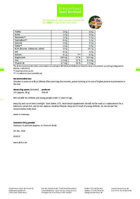 - BCAA (leucine, isoleucine, valine) 5,8 g