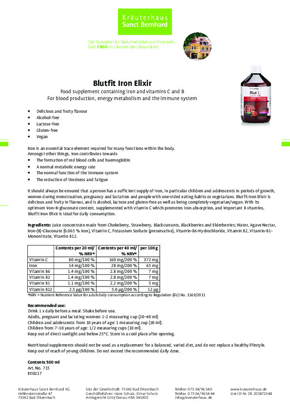 Có nên bổ sung sắt và vitamin cho cơ thể? Sắt là một nguyên tố vi lượng cần thiết cho nhiều chức năng trong cơ thể như góp phần vào sự hình thành các tế bào hồng cầu và hemoglobin, thúc đẩy quá trình trao đổi chất, tăng cường miễn dịch và giảm mệt mỏi. Sản phẩm Nước uống bổ sung vitamin và sắt Blutfit Iron Elixir có thành phần chính là sắt và các vitamin thiết yếu cho cơ thể cùng với hương vị trái cây thơm ngon, không chứa cồn, lactose và gluten, an toàn phù hợp với mọi lứa tuổi và là sản phẩm lí tưởng để bổ sung sắt và vitamin mỗi ngày. Sản phẩm đã qua kiểm nghiệm, cam kết 100% hàng chính hãng thương hiệu Sanct Bernhard của Đức.