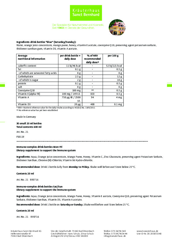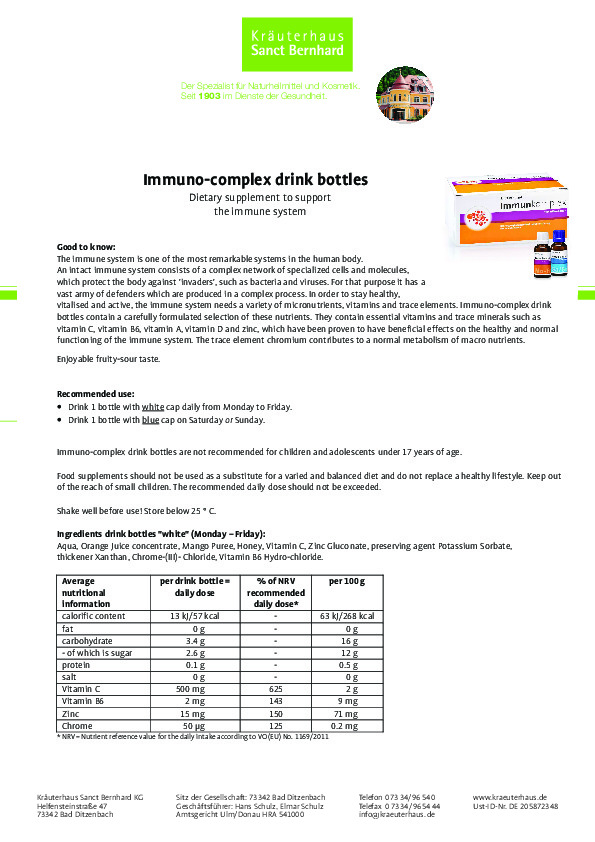 Hệ miễn dịch là một hệ thống được tạo thành từ mạng lưới các tế bào đặc biệt, protein, mô và cơ quan. Chúng phối hợp với nhau để bảo vệ con người chống lại vi trùng và vi sinh vật có trong cuộc sống hàng ngày. Hệ miễn dịch có thể nhận ra hàng triệu kháng nguyên khác nhau và sẽ phát huy toàn bộ chức năng cần thiết để loại bỏ hầu hết những yếu tố gây bệnh xâm nhập. Nếu hoạt động tốt, hệ thống phòng thủ phức tạp này có thể ngăn chặn các vấn đề sức khỏe từ cảm lạnh thông thường cho đến ung thư nguy hiểm. Sản phẩm Nước uống tăng cường miễn dịch Immuno complex small glass bottles với hương vị trái cây thơm ngon là sự kết hợp các vitamin và nguyên tố vi lượng quan trọng giúp hệ thống miễn dịch hoạt động mạnh mẽ. Sản phầm cam kết 100% chính hãng của thương hiệu Sanct Bernhard của Đức.