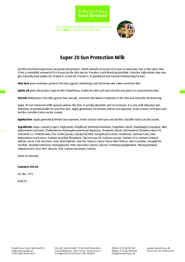 Super 20 Sun Protection Milk Chứa gel lô hội với nồng độ cao, dầu jojoba nguyên chất tự nhiên, vitamin E, dầu cà rốt, vitamin C, D-panthenol và các yếu tố giữ ẩm tự nhiên: