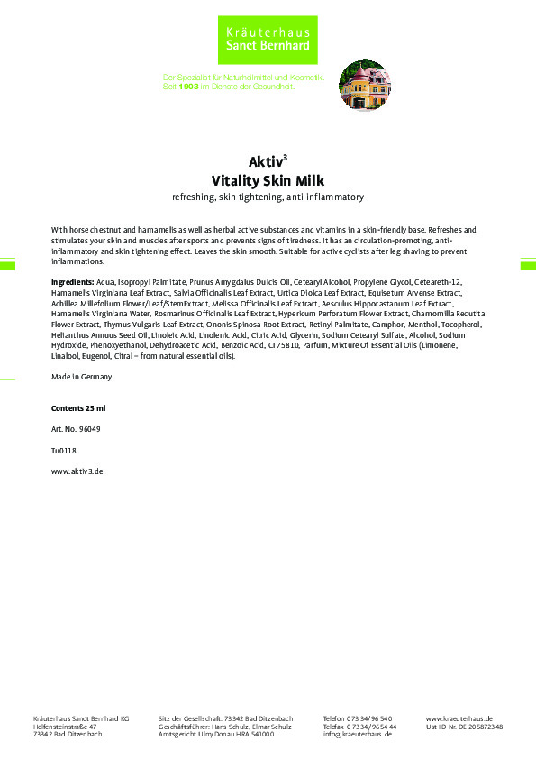 Sữa dưỡng da và cơ bắp Aktiv 3 Vitality Skin Milk chứa các thành phần giúp cải thiện tình trạng đau, sưng và căng cơ bắp. Là giải pháp đơn giản, hiệu quả và an toàn giúp cải thiện thoái hóa, lõa hóa cơ, hỗ trợ lưu thông và tuần hoàn máu, giúp cơ bắp của bạn được thả lỏng, thoải mái, thư giãn, giúp cơ bắp được linh hoạt hơn. Sản phẩm đã qua kiểm nghiệm và cam kết 100% hàng chính hãng thương hiệu Sanct Bernhard của Đức.