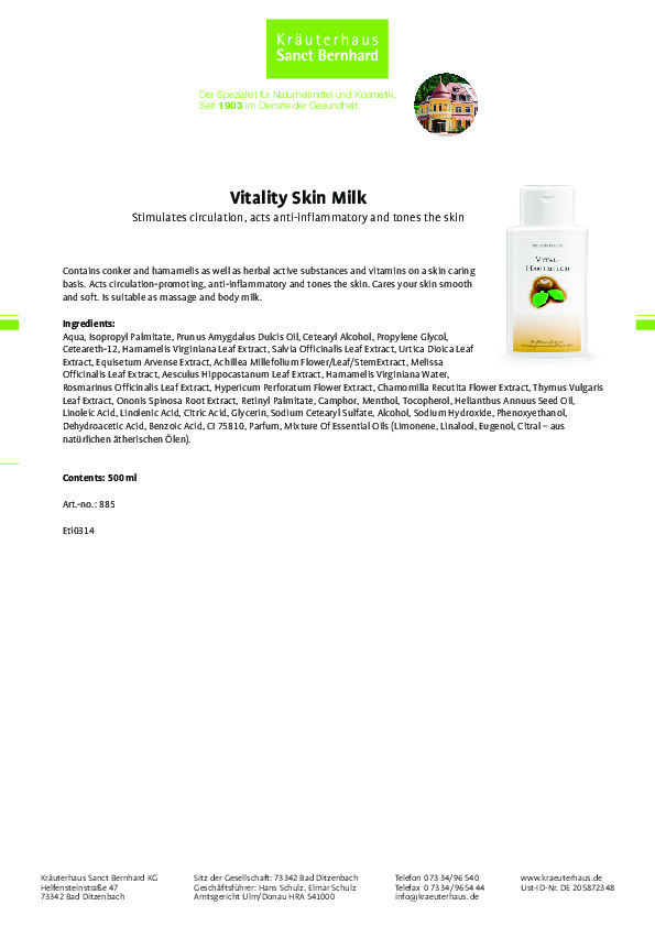 Sữa dưỡng thể dưỡng ẩm chiết xuất hạt dẻ ngựa Vitality Skin Milk với chiết xuất từ cây hạt dẻ ngựa, chiết xuất cây phỉ cùng với các chiết xuất thảo dược khác và các vitamin giúp kích thích tuần hoàn, chống viêm và làm săn chắc da, da mềm mại và mịn màng, dùng dưỡng da toàn thân.