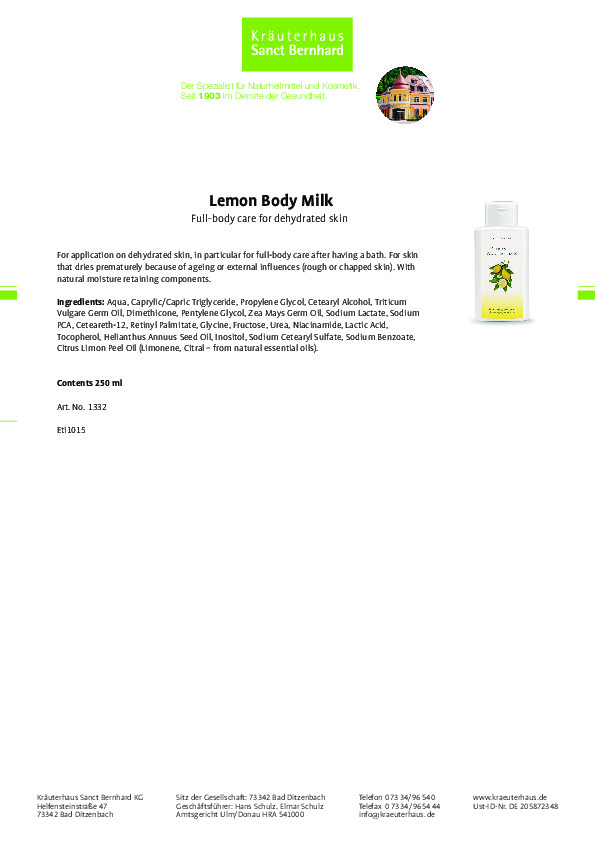 Sản phẩm Sữa dưỡng thể hương chanh Lemon Body Milk là sự kết hợp hoàn hảo của chanh và các tinh chất dưỡng da với hương chanh tràn đầy năng lượng mang đến cảm giác sảng khoái, cho bạn những trải nghiệm mới lạ, hoàn hảo để khởi đầu một ngày mới tốt lành đồng thời nhẹ nhàng cung cấp độ ẩm nuôi dưỡng da luôn mềm mại, mịn màng tươi trẻ dài lâu cùng thời gian. Sản phẩm đã qua kiểm nghiệm da liễu, cam kết 100% hàng chính hãng thương hiệu Sanct Bernhard của Đức