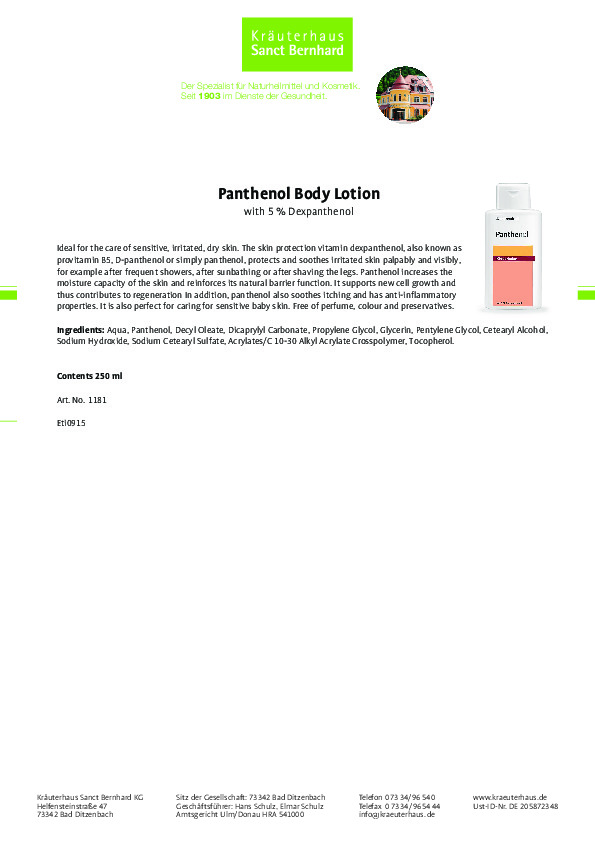 Sữa dưỡng thể Panthenol Body Lotion là dưỡng thể chăm sóc da tay và toàn thân có thành phần Dexpanthenol và các dưỡng chất thiết yếu phù hợp với việc chăm sóc da hàng ngày. Sản phẩm giúp bạn có được một làn da mịn màng và dẻo dai, cung cấp cho làn da độ ẩm phù hợp với hương thơm dễ chịu mang lại cho bạn một tâm trạng thỏa mái, thư giãn suốt cả ngày dài. Sản phẩm đã được kiểm nghiệm da liễu cam kết 100% hàng chính hãng thương hiệu nổi tiếng Sanct Bernhard của Đức