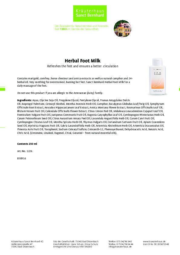 Kết hợp tinh hoa từ các loại thảo mộc truyền thống, sản phẩm Sữa massage chân thảo dược Herbal Foot Milk đem đến liệu pháp thư giãn và chăm sóc cơ thể tuyệt vời. Chỉ 20 phút ngâm chân hoặc ngâm tắm trong nước thảo dược hằng ngày giúp đem lại những tác dụng kỳ diệu đối với cơ thể, đặc biệt điều trị các bệnh đau nhức xương khớp, lạnh chân, mất ngủ, chống mệt mỏi, thư giãn, giảm stress, tăng cường tuần hoàn và nâng cao sức đề kháng cơ thể. Sản phẩm đã qua kiểm nghiệm cam kết 100% hàng chính hãng thương hiệu Sanct Bernhard của Đức.