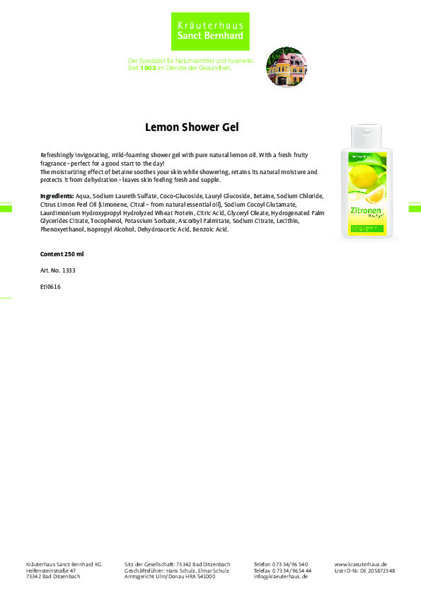 Sản phẩm Sữa tắm chanh dưỡng ẩm Lemon Shower Gel là sự kết hợp hoàn hảo của chanh và các tinh chất dưỡng da với hương chanh tràn đầy năng lượng mang đến cảm giác sảng khoái, cho bạn những trải nghiệm mới lạ, hoàn hảo để khởi đầu một ngày mới tốt lành đồng thời nhẹ nhàng làm sạch da, lấy đi những bụi bẩn, bã nhờn trên da, cung cấp độ ẩm nuôi dưỡng da luôn mềm mại, mịn màng tươi trẻ dài lâu cùng thời gian. Sản phẩm đã qua kiểm nghiệm da liễu, cam kết 100% hàng chính hãng thương hiệu Sanct Bernhard của Đức