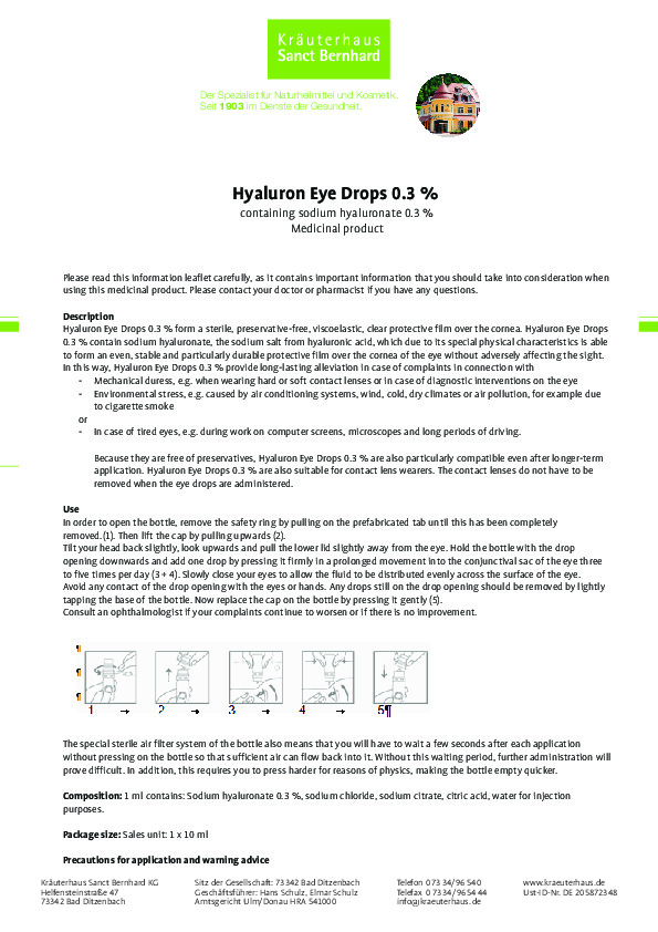 Nước mắt là chất lỏng tiết ra từ tuyến lệ, đóng vai trò quan trọng trong việc bôi trơn và bảo vệ bề mặt nhãn cầu, tránh sự mất nước của niêm mạc, giúp mắt không bị khô và tổn thương. Màng phim có cấu trúc mỏng phủ mặt trước giác mạc và kết mạc nhãn cầu. Khi lớp màng này bị rối loạn, nước mắt giảm đi về cả số lượng hoặc chất lượng dẫn đến tình trạng khô mắt. Để khắc phục tình trạng này biện pháp đơn giản và hiệu quả nhất là sử dụng nước mắt nhân tạo. Thuốc nhỏ mắt Hyaluron 0,3% là một trong sự lựa chọn tốt nhất với bản chất sản phẩm là nước mắt nhân tạo có nồng độ pH và tính chất tương tự với nước mắt tự nhiên giúp điều chỉnh độ ẩm cho mắt trong các trường hợp như khô mắt, đeo kính áp tròng, thường xuyên tiếp xúc với khói bụi đồng thời bảo vệ bề mặt nhãn cầu ngăn ngừa các bệnh lí khác về mắt. Sản phẩm đã qua kiểm nghiệm, cam kết 100% hàng chính hãng thương hiệu Sanct Bernhard của Đức
