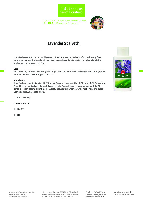 Chiết xuất hoa oải hương là chiết xuất từ nguyên cây Lavandula angustifolia (một loài thực vật có hoa thuộc chi Oải hương trong họ Hoa môi). Hoa oải hương giàu các hoạt chất chống oxy hóa giúp làm ngăn ngừa lão hóa sớm, làm sáng da. Với Lavender Spa giúp làm dịu da, sáng da, làn da của bạn được nuôi dưỡng với một hương thơm quyến rũ.