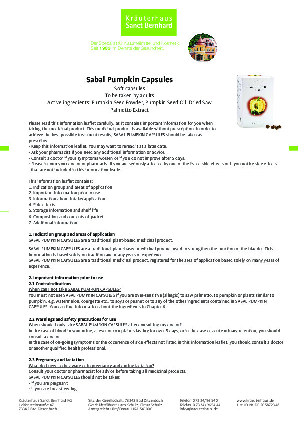 Sản phẩm Viên nang bí ngô Sabal Pumpkin Capsules được kết hợp đặc biệt từ các tinh chất được chiết xuất trong thành phần của quả bí ngô cùng với sự kết hợp của một số loại thảo mộc khô. Sản phẩm có tác động phục hồi và tiếp thêm sinh lực, cải thiện sức khỏe tim mạch, tuyến tiền liệt và chống lại một số loại bệnh ung thư nhất định. Sản phẩm của thương hiệu Sanct Bernhard cam kết 100% hàng chính hãng của Đức.