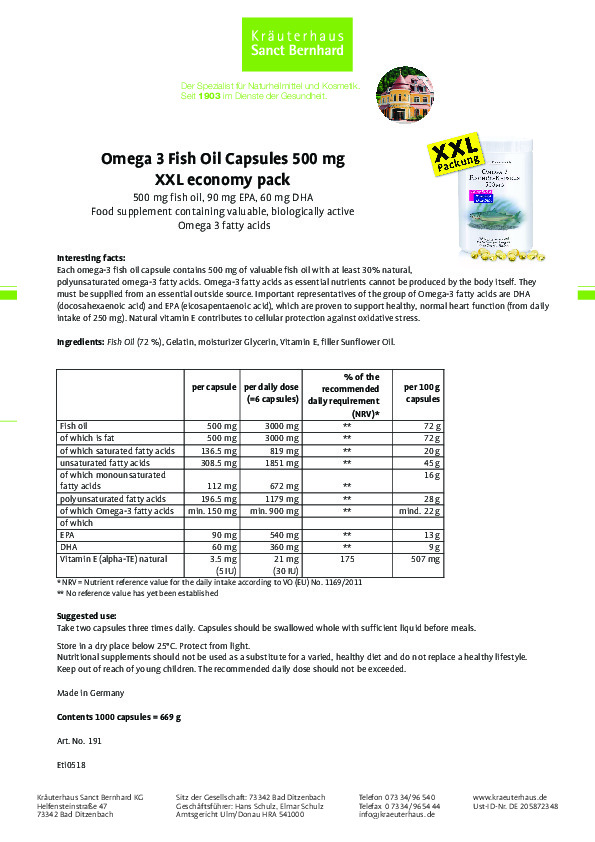 Khi cần thiết, các chất dinh dưỡng thiết yếu, axit béo Omega-3 không thể được sản xuất bởi cơ thể con người, đại diện quan trọng của nhóm axit béo Omega-3 là DHA (docosahexaenoic acid) và EPA (axit eicosapentaenoic).Mỗi viên nang dầu cá Omega 3 của hãng dược phẩm nổi tiếng Sanct Bernhard – CHLB Đức chứa 500mg dầu cá hồi có giá trị với ít nhất 30% axit béo Omega 3 tự nhiên đã được chứng minh rất cần thiết cho não, mắt và tim mạch.