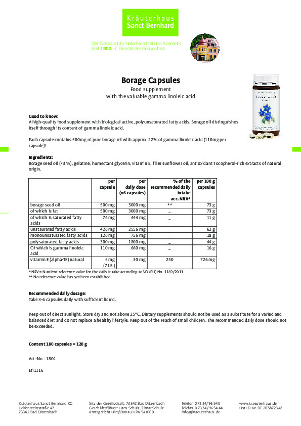 Cây lưu ly (Borage) có tên khoa học là Borago officinalis, là loại thảo mộc có nguồn gốc từ Địa Trung Hải, hoa lưu ly có năm cánh, hình ngôi sao màu xanh dương hoặc phớt tím. Dầu lưu ly được chiết xuất từ hạt của cây lưu ly, là một chất tự nhiên cung cấp hàm lượng acid béo GLA cao nhất trong giới thực vật và được nhiều nơi nghiên cứu thành công. Sản phẩm Viên nang đề kháng tinh chất dầu hạt lưu ly Borage Capsules được bào chế chính từ dầu hạt cây lưu ly tự nhiên đem lại nhiều lợi ích cho sức khỏe của bạn. Sản phẩm đã qua kiểm nghiệm cam kết 100% hàng chính hãng thương hiệu nổi tiếng Sanct Bernhard Đức.