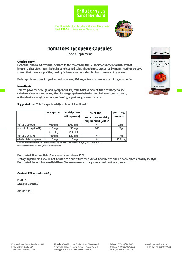 Sản phẩm Viên nang hỗ trợ tim mạch từ cà chua Tomatoes Lycopene Capsules được chiết xuất từ những loại cà chua không biến đổi gen trồng đặc biệt thông qua quy trình bào chế đảm bảo chất lượng quốc tế mang đến cho người dùng công dụng hiệu quả nhất như có tác dụng trong hỗ trợ tim mạch làm sáng da, ngăn ngừa lão hóa sớm, cải thiện thị lực cho mắt, phòng chống một số bệnh ung thư, tốt cho bệnh nhân bị tiểu đường, giảm stress cho bạn giấc ngủ ngon, phòng tránh ung thư... Sản phẩm đã qua kiểm nghiệm, cam kết 100% hàng chính hãng thương hiệu nổi tiếng Sanct Bernhard của Đức.