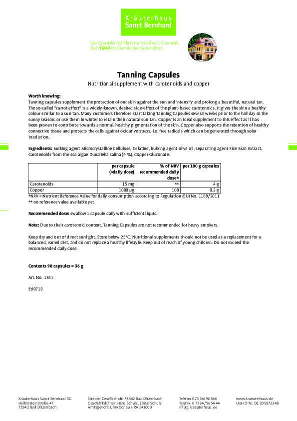 Viên uống Viên nang nhuộm da rám nắng Tanning Capsules bổ sung bảo vệ làn da của chống lại tác động của ánh nắng mặt trời, giúp làn da khỏe mạnh, có màu rám nắng đẹp tự nhiên. "Hiệu ứng cà rốt" là một tác dụng được biết đến rộng rãi của các carotenoid có nguồn gốc thực vật. Mang lại cho làn da một màu khỏe mạnh tương tự như làn da rám nắng. Do đó, nhiều khách hàng bắt đầu dùng carotenoids vài tuần trước kỳ nghỉ hoặc mùa nắng, hoặc sử dụng vào mùa đông để giữ được làn da rám nắng tự nhiên. Sản phẩm đã qua kiểm nghiệm cam kết 100% hàng chính hãng thương hiệu Sanct Bernhard của Đức.