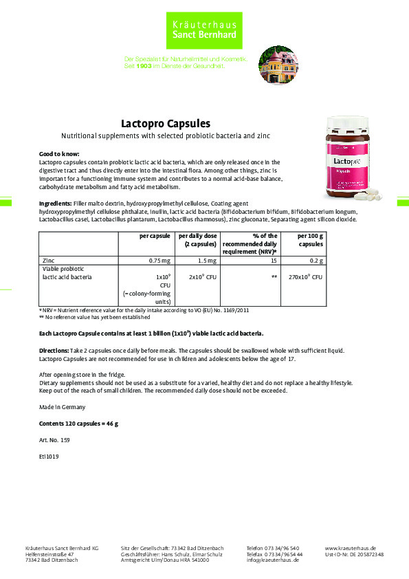 Hệ vi sinh vật ở đường ruột được biết đến như một động lực cho sự phát triển và duy trì hệ miễn dịch khỏe mạnh. Lợi khuẩn Probiotic là một loại lợi khuẩn thuộc nhóm các vi khuẩn sống, tương tự các vi sinh vật có lợi tự nhiên được tìm thấy trong ruột. Chúng còn được gọi là "vi khuẩn thân thiện" hay "vi khuẩn có lợi", những vi khuẩn này được bổ sung vào chế độ ăn nhằm cân bằng hệ vi khuẩn đường ruột để cải thiện sức khỏe. Mỗi viên nang Lactopro chứa ít nhất 1 tỷ vi khuẩn Probiotic thuộc các chủng sau: Bifidobacterium bifidum, Bifidobacterium longum, Lactobacillus casei, Lactobacillus plantarum, Lactobacillus rhamnosus. Những lợi ích chính của Probiotic như :