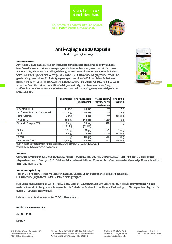 Viên nang uống chống lão hóa Anti Aging SB 500 Kapseln
