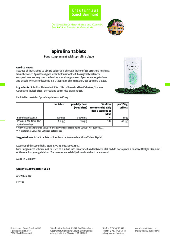 Tảo xoắn (Spirulina) là một loại vi tảo có dạng sợi có màu xanh lục rất đặc trưng, giống như màu diệp lục xanh rì. Chúng sống chủ yếu ở biển và các vùng nước ngọt của khu vực khí hậu cận nhiệt đới, với điều kiện môi trường kiềm ấm, nhiều ánh sáng mặt trời. Tổ chức Y tế thế giới (WHO/OMS) công nhận tảo xoắn Spirulina là thực phẩm bảo vệ sức khỏe tốt nhất của loài người bởi trong nó chứa nhiều thành phần dinh dưỡng có giá trị như: protein dồi dào, hàm lượng vitamin cao( vitamin B1, B2, B6, PP, vitamin E, beta caroten, acid folic), hàm lượng khoáng chất lớn ( sắt, mangan, magie, selen, canxi, kali, photpho). Sản phẩm Viên nén bổ sung chất dinh dưỡng từ tảo xoắn Spirulina Tablets được bào chế trực tiếp từ tảo xoắn phù hợp với nhiều đối tượng đặc biệt là người tập thể thao, người đang theo chế độ ăn kiêng, giảm béo, người ăn chay. Sản phẩm đã qua kiểm nghiệm, cam kết 100% hàng chính hãng thương hiệu Sanct Bernhard của Đức.