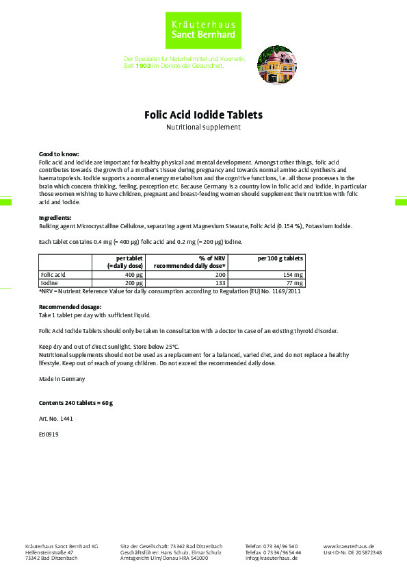 Các nghiên cứu gần đây cho thấy tình trạng thiếu i-ốt của phụ nữ mang thai diễn ra khá phổ biến, do vậy việc bổ sung đầy đủ lượng i-ốt là rất cần thiết cho sức khỏe của phụ nữ chuẩn bị mang thai, mong muốn có con và bà bầu. Sản phẩm Viên nén bổ sung iốt và axit folic Folic Acid Iodine với lượng I-ốt & Axit Folic tối ưu cần thiết cho sức khoẻ bà bầu và sự phát triển lành mạnh của thai nhi nhằm thúc đẩy sự phát triển não bộ, thị lực và thính giác của thai nhi ngay khi còn ở trong bụng mẹ. Sản phẩm đã qua kiểm nghiệm, cam kết 100% hàng chính hãng thương hiệu Sanct Bernhard của Đức.