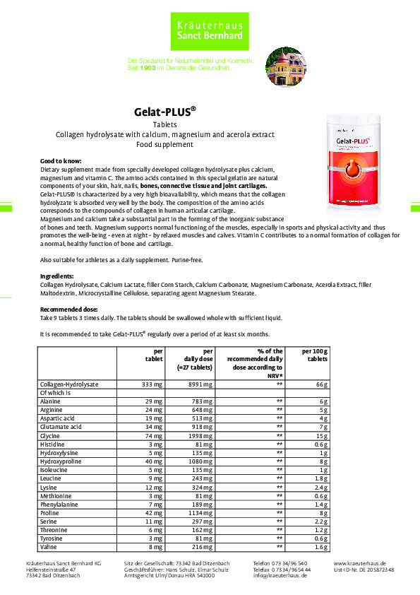 Collagen là một polypeptide được cấu tạo từ các nhiều các acid amin, chiếm 25% tổng lượng protein của cơ thể và đến 70% cấu trúc da. Collagen đóng vai trò như “chất keo dính” kết nối các mô trong cơ thể và kích thích quá trình trao đổi chất. Collagen thủy phân được sản xuất từ collagen có trong xương, da và các mô liên kết của các loài động vật như cá, ngựa, heo, thỏ và các loại gia súc. Sản phẩm Viên nén cải thiện xương khớp từ Collagen thủy phân Gelat Plus được bào chế chính từ collagen thủy phân giúp chia nhỏ các phân tử collagen để dễ dàng hấp thụ vào trong cơ thể hơn, không gây nóng , không gây dị ứng, không gây nổi mụn, không gây tăng cân bên cạnh đó còn kết hợp thêm canxi, magie và vitamin C góp phần đem lại hiệu quả tốt nhất cho cơ thể bạn. Sản phẩm đã qua kiểm nghiệm, cam kết 100% hàng chính hãng thương hiệu Sanct Bernhard của Đức