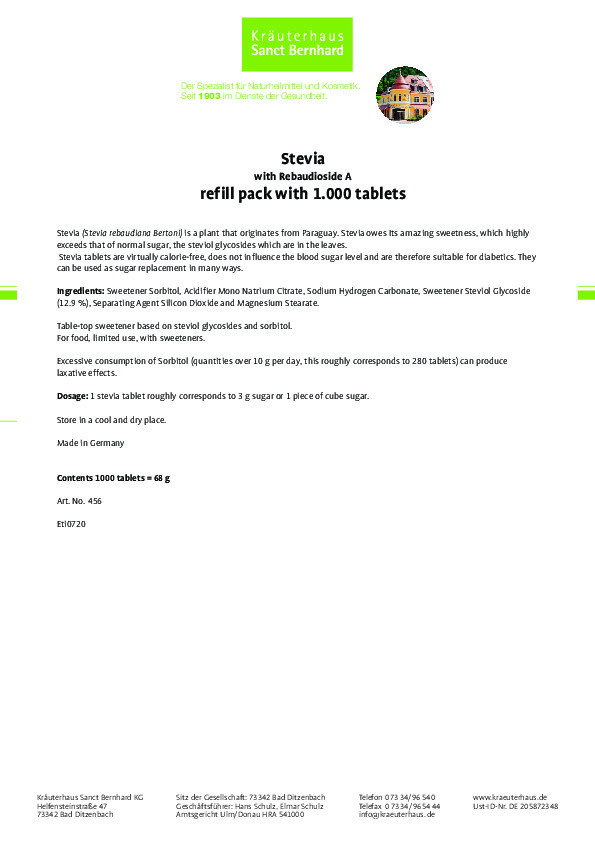 Để đạt được cân nặng khỏe mạnh, điều quan trọng là bạn phải sống một lối sống lành mạnh. Mặc dù các sản phẩm khác nhau có thể hỗ trợ để đạt được mục tiêu giảm cân của bạn, nhưng việc ăn một chế độ ăn kiểm soát năng lượng lành mạnh và đảm bảo bạn tham gia vào các hoạt động thể chất đầy đủ và phù hợp sẽ giúp bạn trên hành trình đến với bạn khỏe mạnh hơn. Một trong số đó là việc điều chỉnh lượng đường trong cơ thể bằng cách sử dụng sản phẩm Viên nén đường ăn kiêng cỏ ngọt Stevia Tablets. Mỗi viên cung cấp một công thức chuẩn với một chất ngọt tự nhiên độc đáo từ cây cỏ ngọt stevia. Thay thế đường dành cho những người ăn kiêng và người tiểu đường hoàn toàn tự nhiên an toàn với mọi lứa tuổi. Sản phẩm đã qua kiểm nghiệm, cam kết 100% hàng chính hãng thương hiệu Sanct bernhard của Đức.
