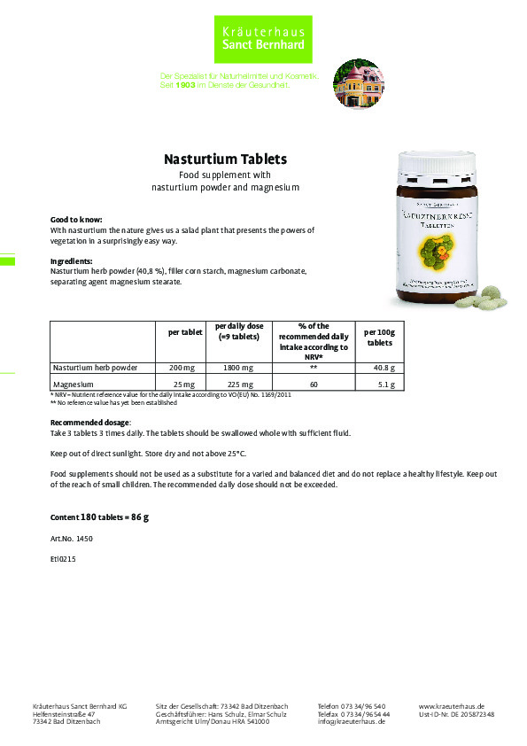 Bên cạnh đó sản phẩm Viên nén kháng viêm chiết xuất cải xoong Nasturtium Tablets của công ty dược phẩm Sanct-Bernhard từ CHLB Đức còn chứa Magie là một khoáng chất tuyệt vời cho cơ thể, đây là một khoáng chất rất cần thiết cho sản xuất năng lượng, sự co cơ, chức năng thần kinh và duy trì xương chắc khỏe.