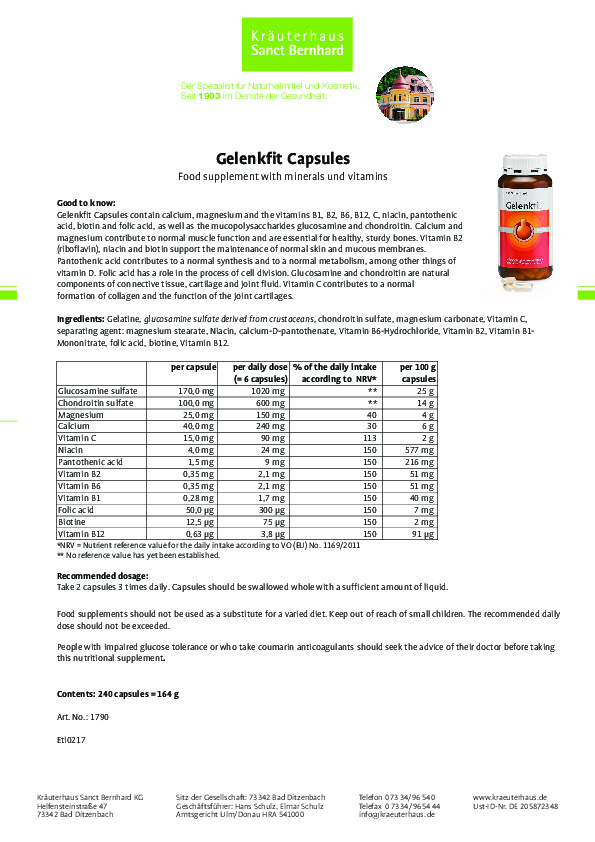 - Viên uống hỗ trợ cơ khớp Gelenkfit Capsules với sự kết hợp của glucosamine và chondroitin cùng với các khoáng chất và vitamin quan trọng với sức khỏe xương khớp: canxi, magiê và các vitamin B1, B2, B6, B12, C, niacin, axit pantothenic, biotin, axit folic, giúp cung cấp thành phần thiết yếu cho việc hình thành sụn, dịch khớp và các mô liên kết đảm bảo cho khớp hoạt động trơn chu.