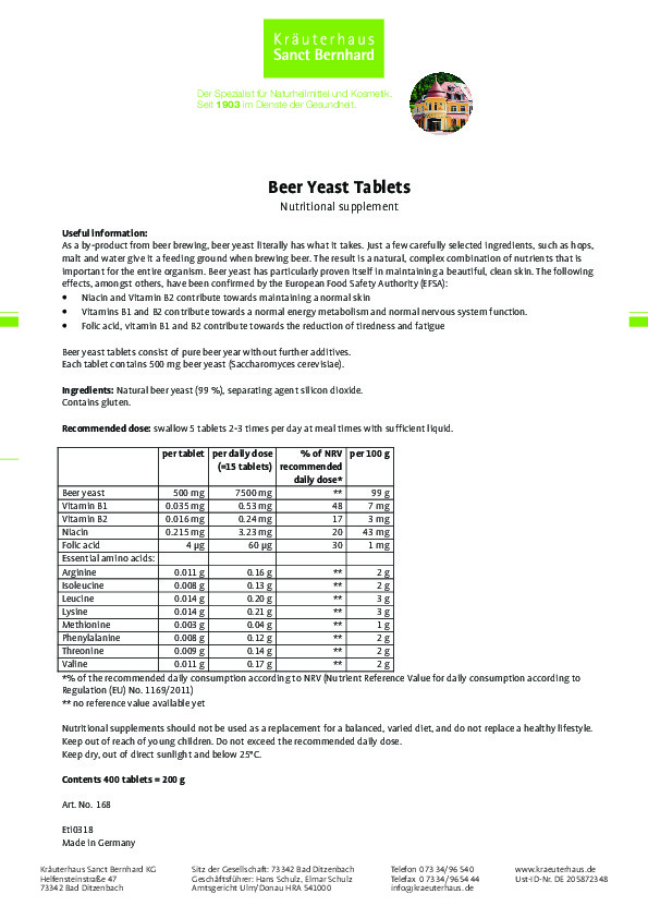 Từ xưa con người đã phát hiện men bia có nhiều tác dụng rất tốt đối với sức khỏe. Men bia có tên khoa học là Saccharomyces cerevisiae Hans, thuộc họ Nấm men Saccharomycetaceae. Đây là loại thực phẩm có giá trị dinh dưỡng cao với 16 loại axit amin, 17 loại vitamin, 14 loại muối khoáng. Sản phẩm viên uống Beer Yeast từ hãng Sanct Bernhard kết hợp men bia với các vitamin, các acid amin thiết yếu giúp chăm sóc sức khỏe và sắc đẹp từ bên trong
